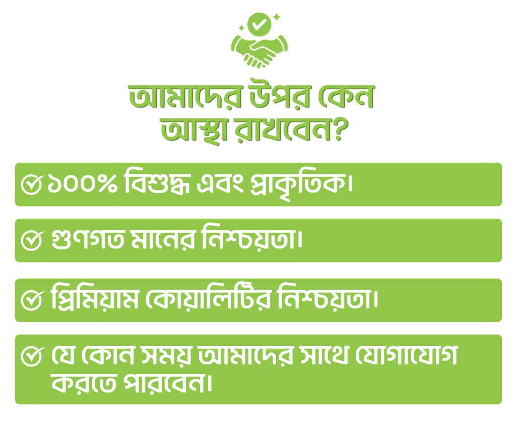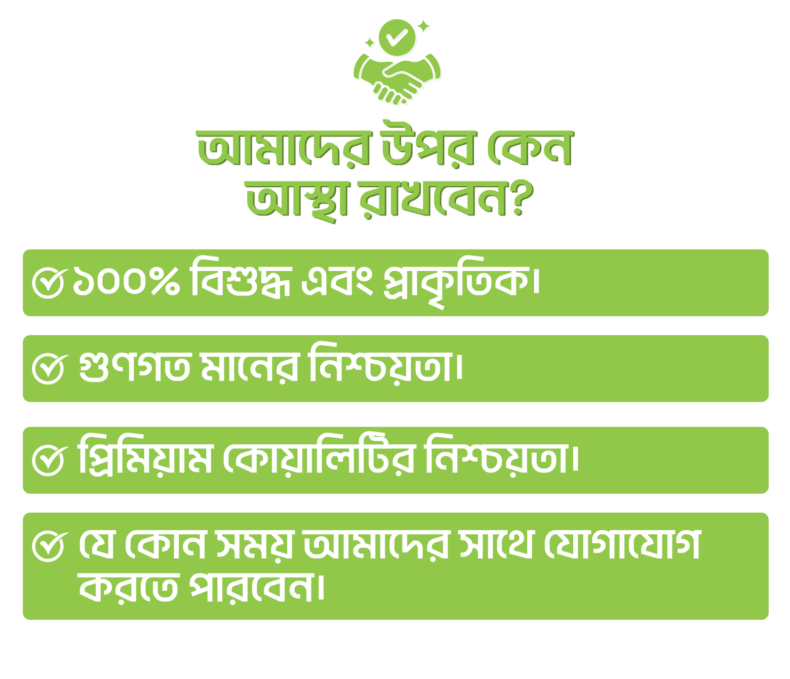 আমাদের প্রোডাক্টে কোনো প্রকার কেমিকেল বা স্টেরয়েড নেই। সব উপাদানই প্রাকৃতিক এবং অনেক পুরনো ভেষজ চিকিৎসায় ব্যবহৃত হয়। এই উপাদানগুলো মানব দেহের জন্য খুবি উপকারি এবং কার্যকর।